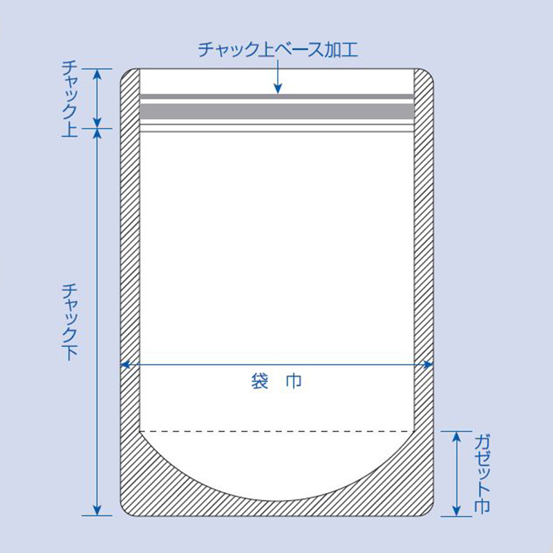 | 仕様 | チャック付、両サイド6mmシール、コーナーカット、ノッチ付 |
