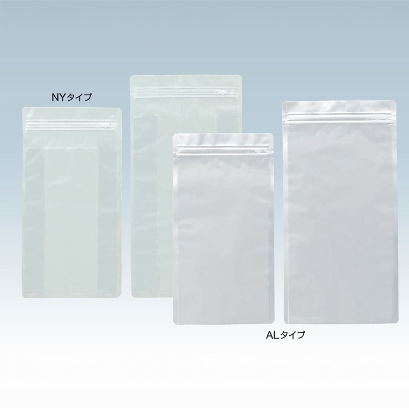 大型サイズのサイドガゼットタイプチャック付ラミネート袋です。サイドガゼットがひろがり箱型になるので、ディスプレイ時はたて置き、ひら積みの両方に活用できます。NYタイプは丈夫で各種軽量の原材料入れとしてご利用いただけます。ALタイプは防湿性がありますのでお茶など嗜好品に、各種軽量の原材料入れとしてご利用いただけます。 WBタイプ: