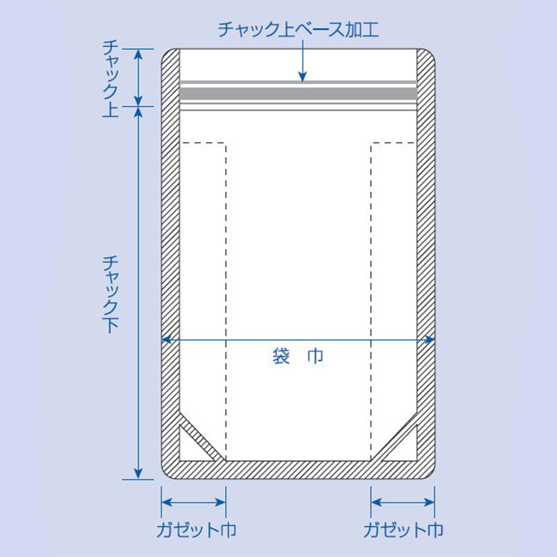 | 仕様 | チャック付、両サイド6mmシール、コーナーカット、ノッチ無し |