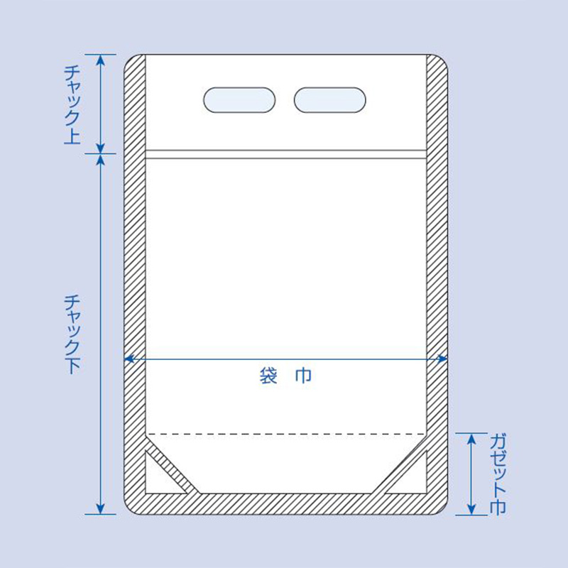 | 仕様 | チャック付、手さげ穴付、両サイド8mmシール、コーナーカット、ノッチ無し |