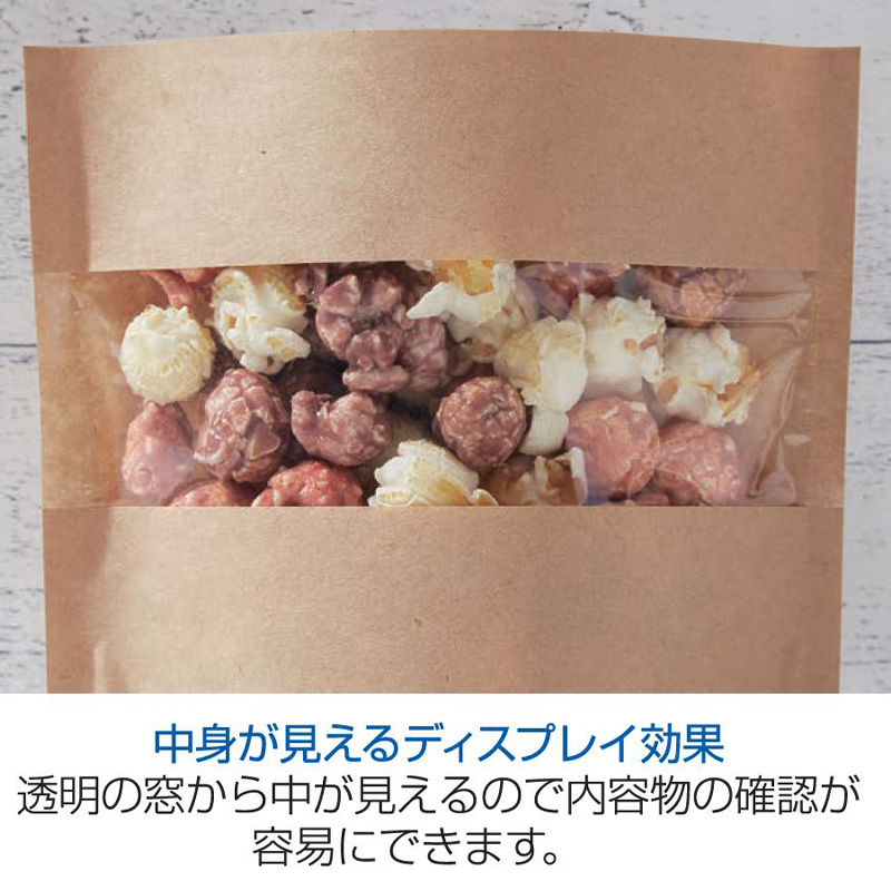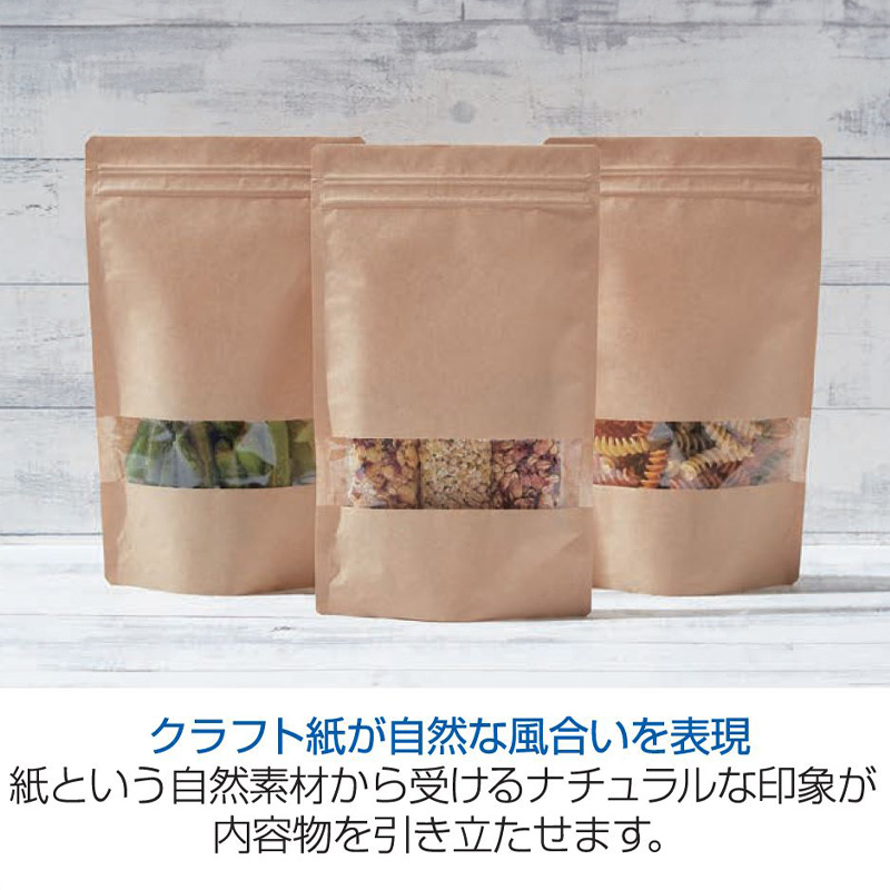 自然な風合いのラミジップクラフトタイプに窓を付けたチャック付ラミネートスタンドパックです。ガスバリア性・防湿性の高いフィルムを使用しています。紙という自然素材から受けるナチュラルな印象が内容物を引き立たせます。また、窓付のため自然な風合いを損なわず、内容物の確認が容易です。透明の窓もガスバリア性・防湿性の高いフィルムをしていますので、乾燥農産加工品、乾燥海産加工品、オーガニック素材、お茶・コーヒー・紅茶などの嗜好品に幅広くご利用いただけます。