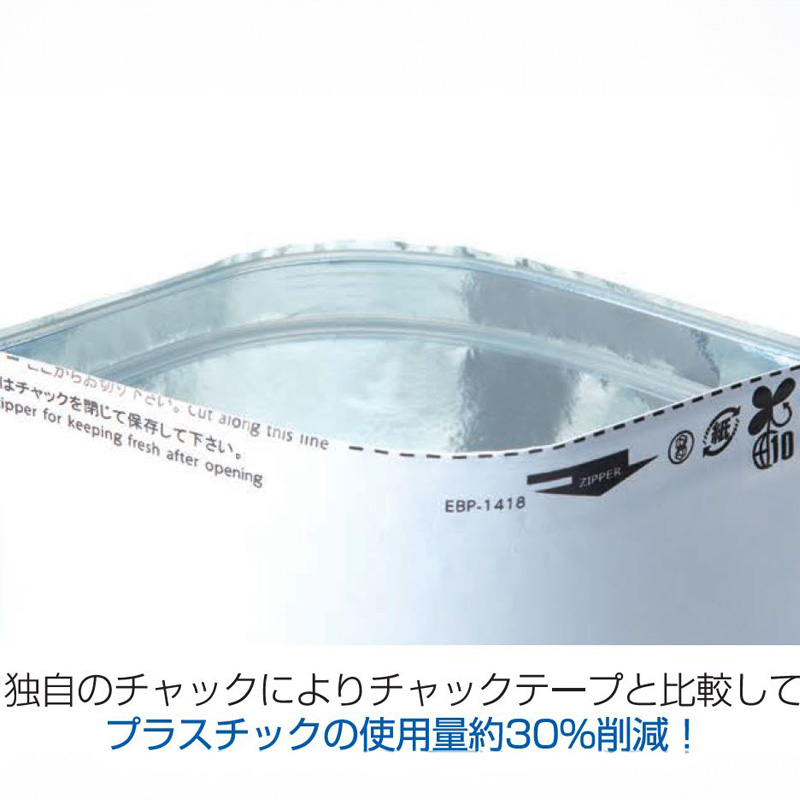 紙素材でありながら高いバリア性を備えた新時代のラミジップが誕生しました。セイニチ独自のチャック(直付けチャック)により、チャック部のプラスチック使用量を約30%削減し、脱プラスチックを実現しています。リサイクル識別表示マークは紙分類化に成功しました。食品・医療用途向け純白紙を採用し貴社の商品を引き立てます。