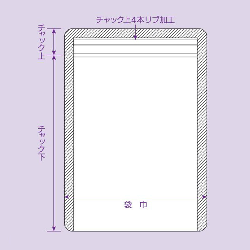 | 仕様 | チャック付、両サイド6mmシール、コーナーカット、ノッチ付 |