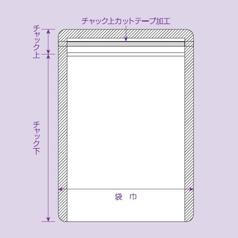| 仕様 | チャック付、両サイド6mmシール、コーナーカット、ノッチ付 |