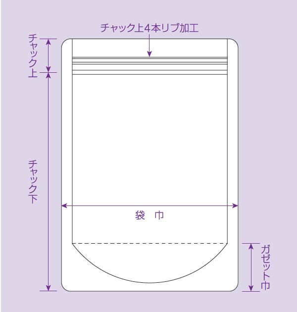 | 仕様 | チャック付、両サイド6mmシール、コーナーカット、ノッチ付 |