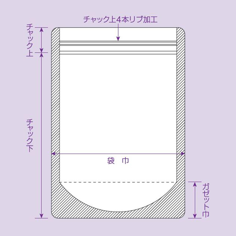 | 仕様 | 容器包装識別マーク(PP)、易カット性、6mmシール、底舟形シール、4角Rカット、チャック付(チャック上カットテープ加工)、ノッチ付 |