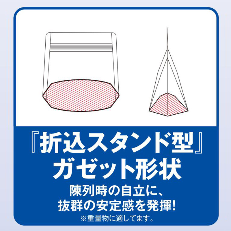 ヨコ長形状なので内容物が取り出しやすく、陳列時に安定して自立するガゼット形状。店頭で見栄えを追及したこだわりサイズのチャック付ラミネートスタンドパックです。バリア性、防湿性、遮光性があり、菓子類、農水産加工品、健康食品などにご利用いただけます。