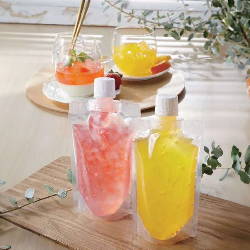 2ピースキャップ付・透明スタンド袋。ハイガスバリアのフィルムを使用しています。カラーキャップ対応。ヒンジキャップ対応(ボイル対応品あり)。