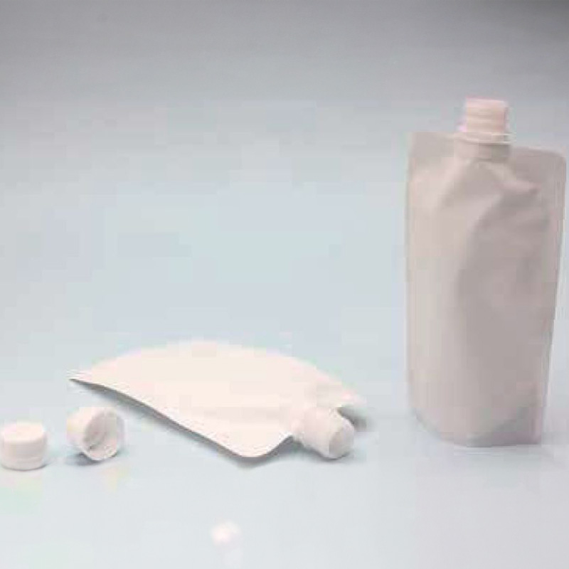 2ピースキャップ付・白印刷スタンド袋。ガスバリア性に優れたフィルムを使用しています。