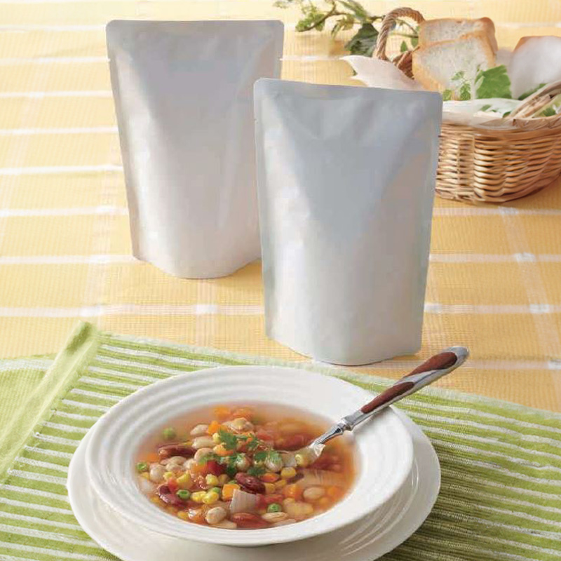 白印刷を施したハイレトルトスタンド袋ハイガスバリアのアルミ箔を使用しています。