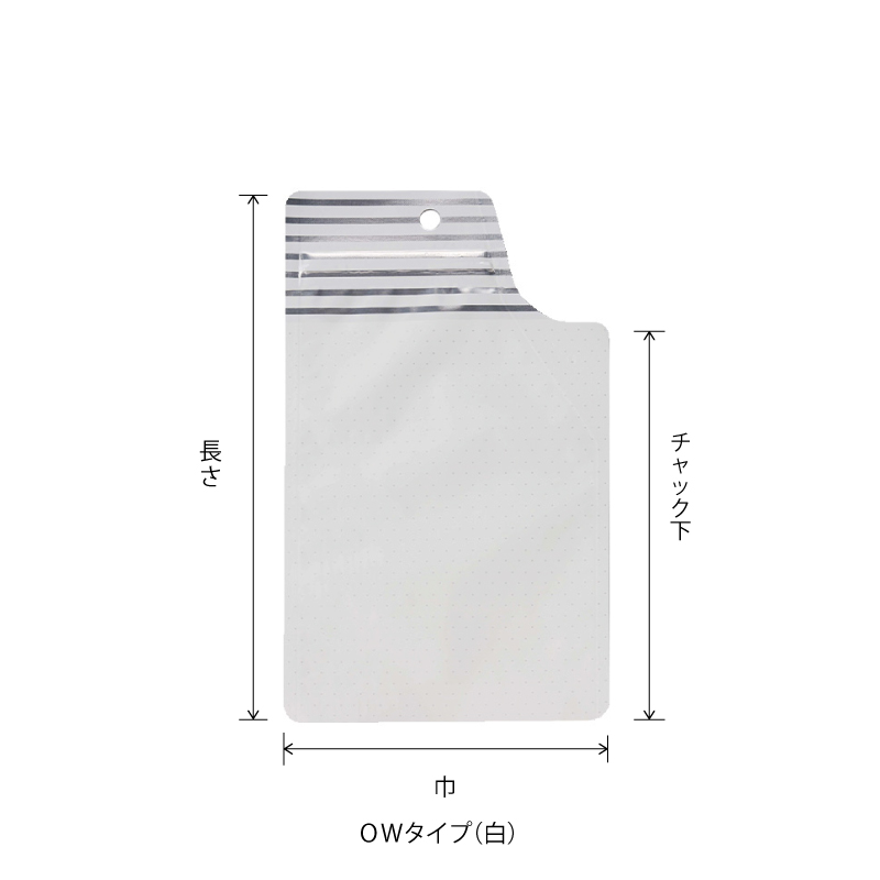 | 仕様 | チャック付、フック穴付、両サイド10mmシール、コーナーカット、ノッチ付 |