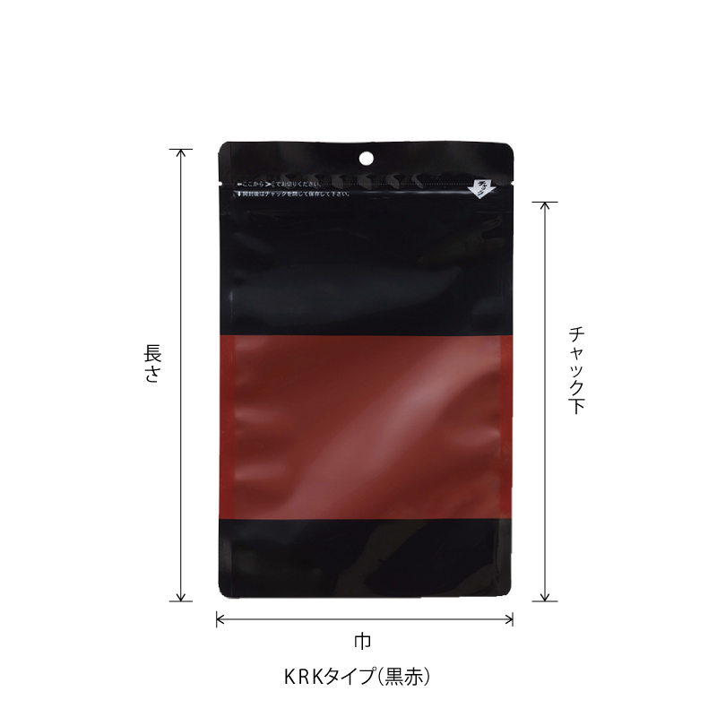 KRKタイプ:両面に光沢黒のシャープなデザインが施された三方チャック袋です。表面中央の窓から見える地下に赤色のアクセントが広がり、中の商品が際立ちます。SKSタイプ:表面に光沢白の洗練されたデザインが光り輝く三方チャック袋です。表面中央の窓から見える下地に黒を敷き詰め、中の商品をシャープに引き立てます。 ※KRKJ・SKSJはKRK・SKSタイプの小口商品です。