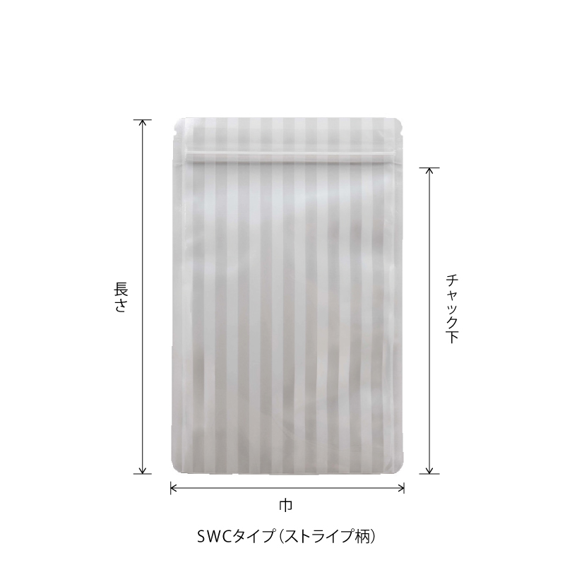 SWCタイプ:白の透かしラインがほのかに輝く、シンプルで華やかな三方チャック袋です。中の商品を美しく引き立てます。SVCタイプ:表面の白ストライプの窓から見える下地に黒を敷き詰め、中の商品を美しく引き立てます。 ※SWCJ・SVCJはSWC・SVCタイプの小口商品です。