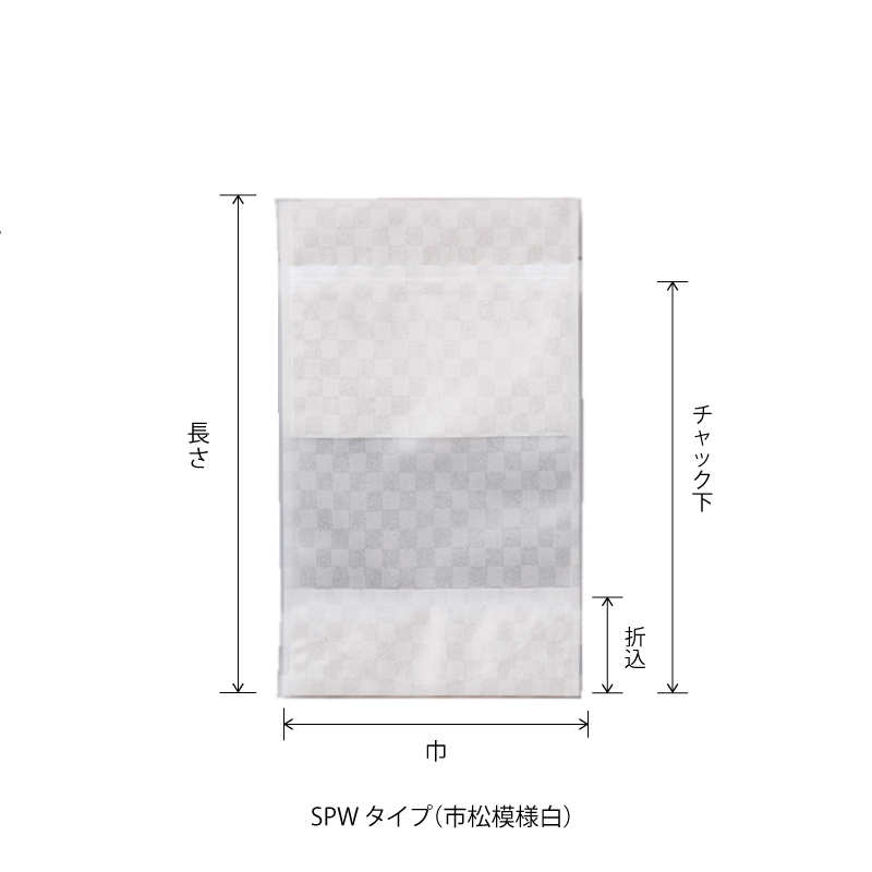 マットバリアOPに市松模様を印刷し、白と金の2タイプ高級感を持たせ、より商品を引き立てるオリジナル規格袋です。商品を充填すれば自立し、店頭でのディスプレイにも最適です。※SPWJ・SPGJはSPW・SPGタイプの小口商品です。
