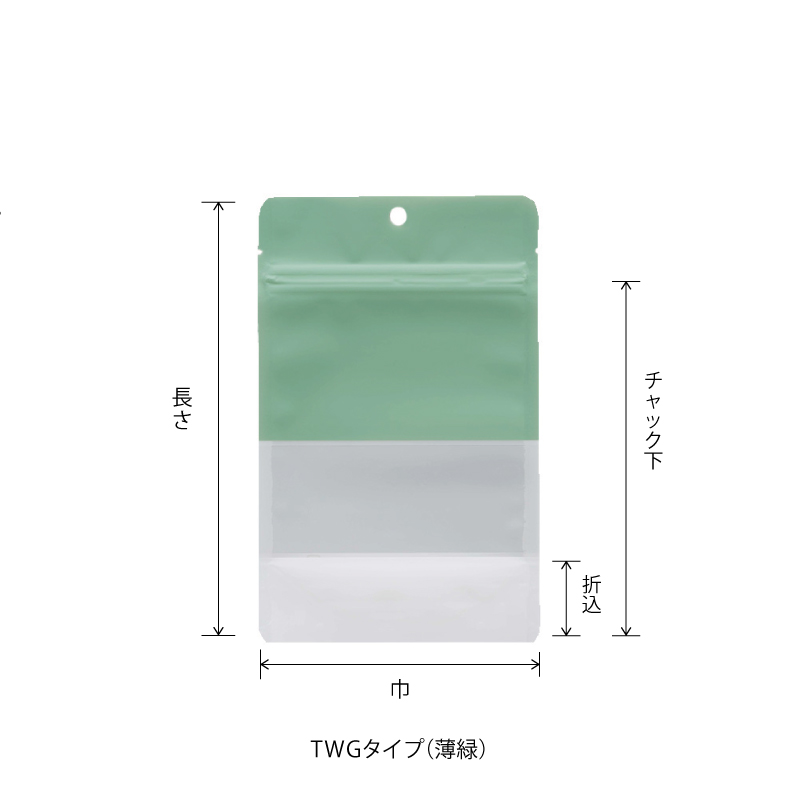 日本の伝統色、薄緑色と砂色の2つの色から選べる、高品質なマット印刷仕上げのチャック付スタンドパック袋です。透明窓から中身がスッキリ三重、高級感のある仕上げです。 ※TWGJ・TWSJはTWG・TWSタイプの小口商品です。