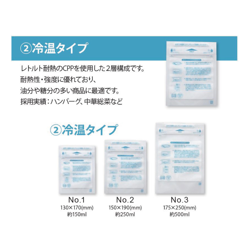 レトルト耐熱のCPPを使用した2層構成です。耐熱性・強度に優れており、油分や糖分の多い商品に最適です。