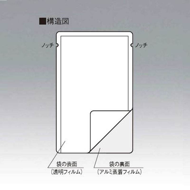 | 仕様 | アルミ蒸着、片面透明、10mmシール、コーナーカット、ノッチ付 |