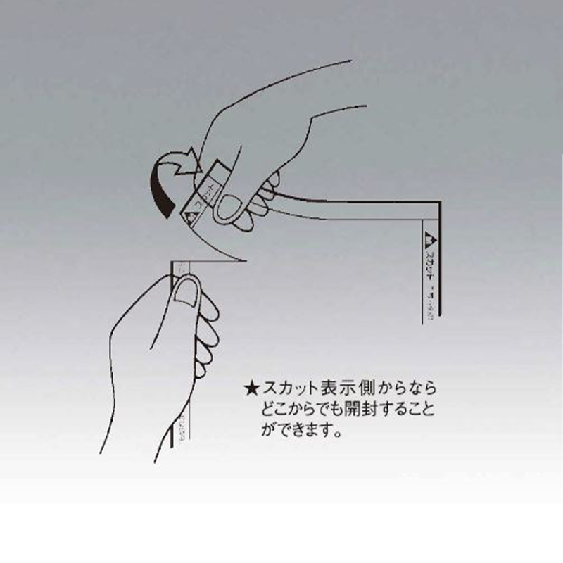 スカット加工(易開封加工)の両サイド(表示側)どこからでも開封できます。真空包装適性。低温(-40°C)性に優れ、加熱殺菌(100°C×30分)。