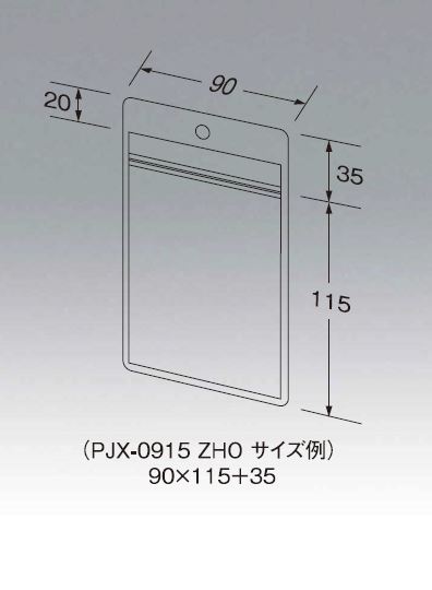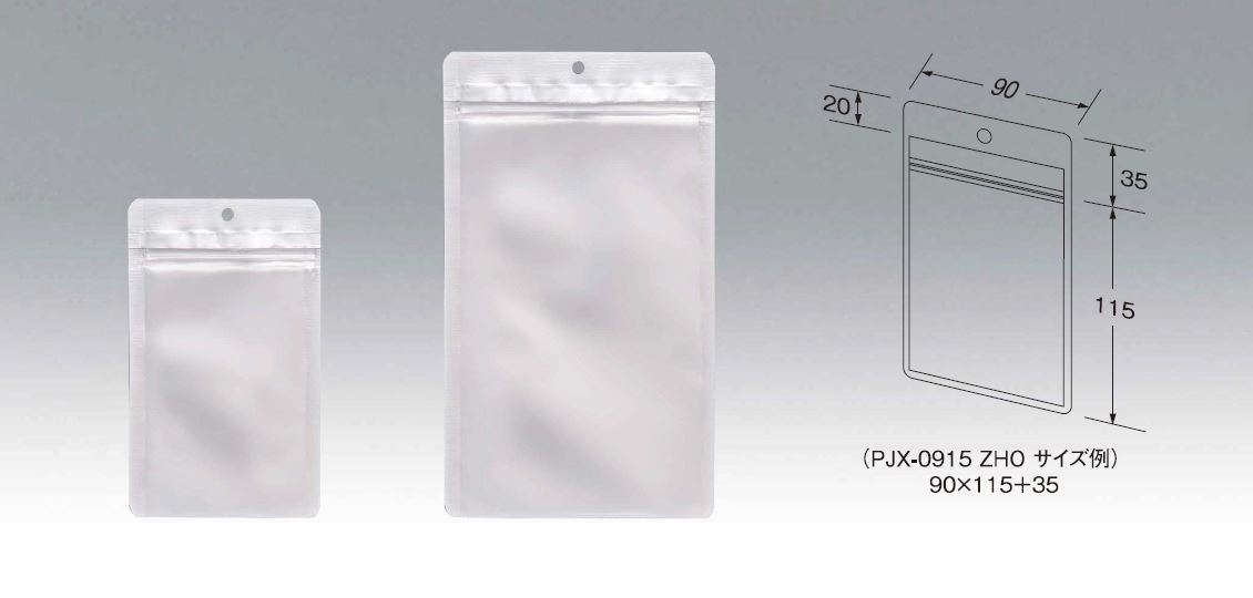 | 仕様 | アルミ蒸着、片面透明、頭20・サイド7mmシール、チャック付、フック穴付、コーナーカット、ノッチ付 |
