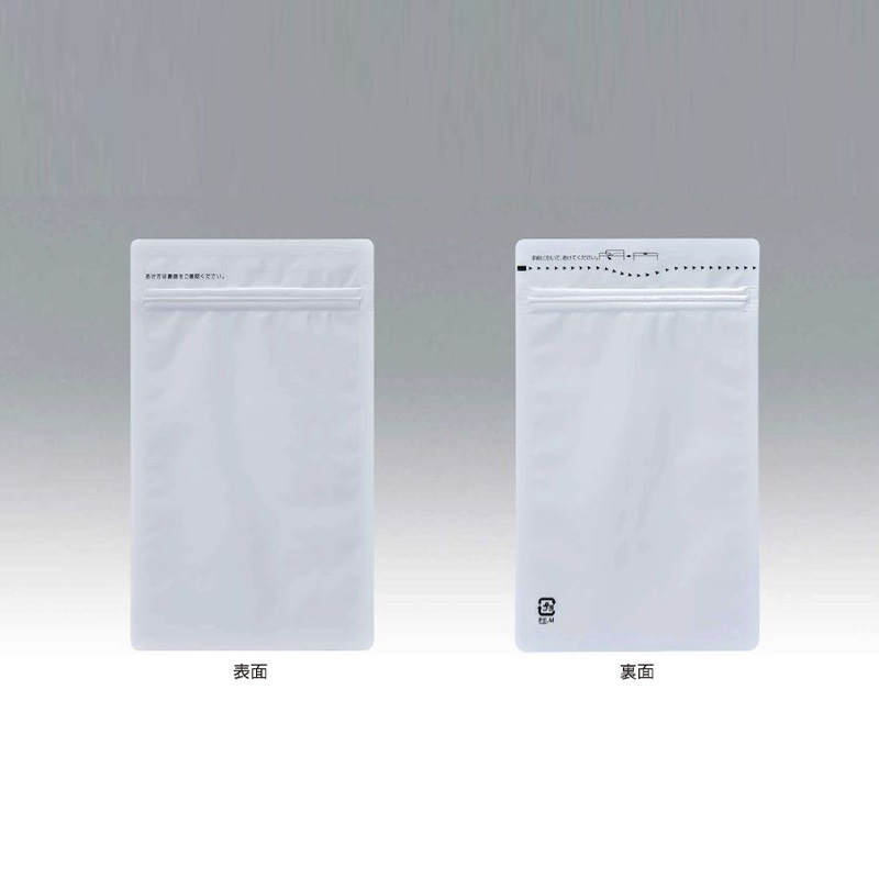 アルミ箔を使用したチャック付包装です。総白ベタ印刷。手で簡単に切れる易開封加工(段差レーザーカット)。遮光性と防湿性に優れ、ガスバリアー性があります。