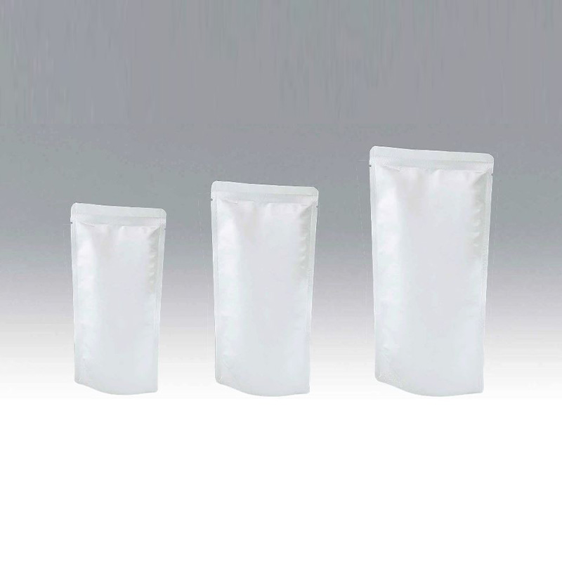 加熱殺菌(130°C×30分)可能。白色の総ベタ印刷。遮光性、耐油性に優れた、スタンディングタイプです。