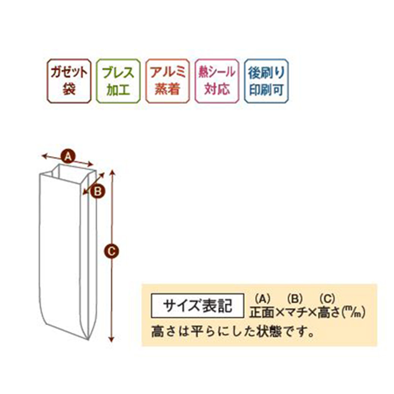 | 機能 | ガスバリア性(脱酸素剤使用可)・防湿性・遮光性(アルミ蒸着)・熱シール対応 |