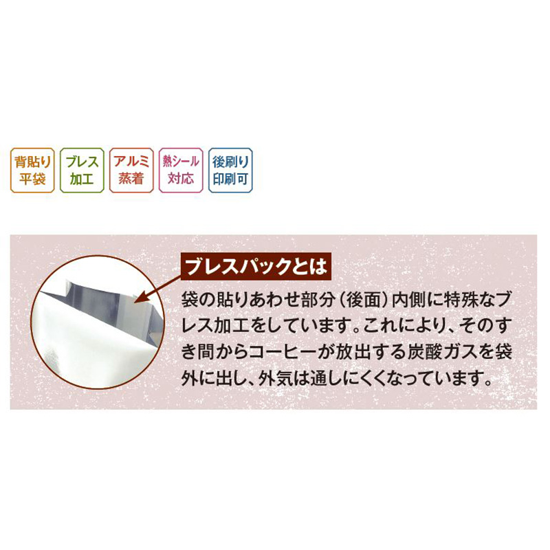 【ブレスパックとは】袋の貼り合わせ部分(後面)内側に特殊なブレス加工をしています。これにより、そのすき間からコーヒーが放出する炭酸ガスを袋外に出し、外気は通しにくくなっています。