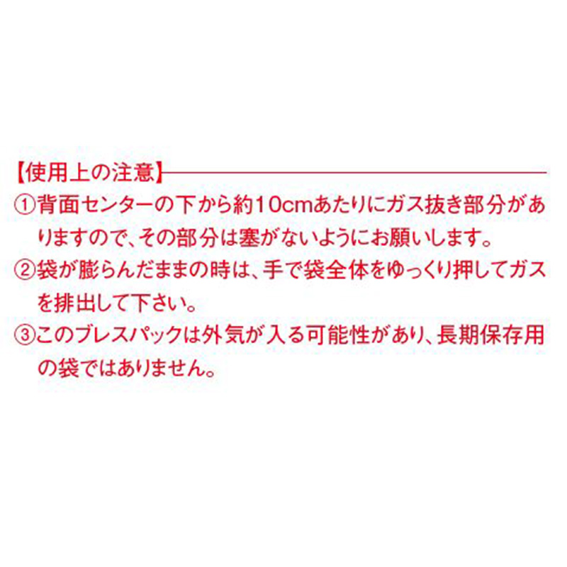 【使用上の注意】背面センターの下から約10cmあたりにガス抜き部分がありますので、その部分は塞がないようにお願いいたします。袋が膨らんだままの時は、手で袋全体をゆっくり押してガスを排出してください。このブレスパックは外気が入る可能性があり、長期保存用の袋ではありません。