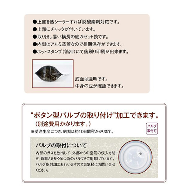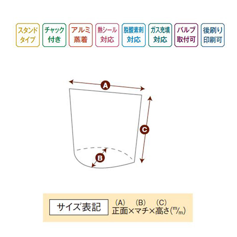 | 機能 | ガスバリア性(脱酸素剤使用可)・防湿性・遮光性・熱シール対応・ガス充填対応 |