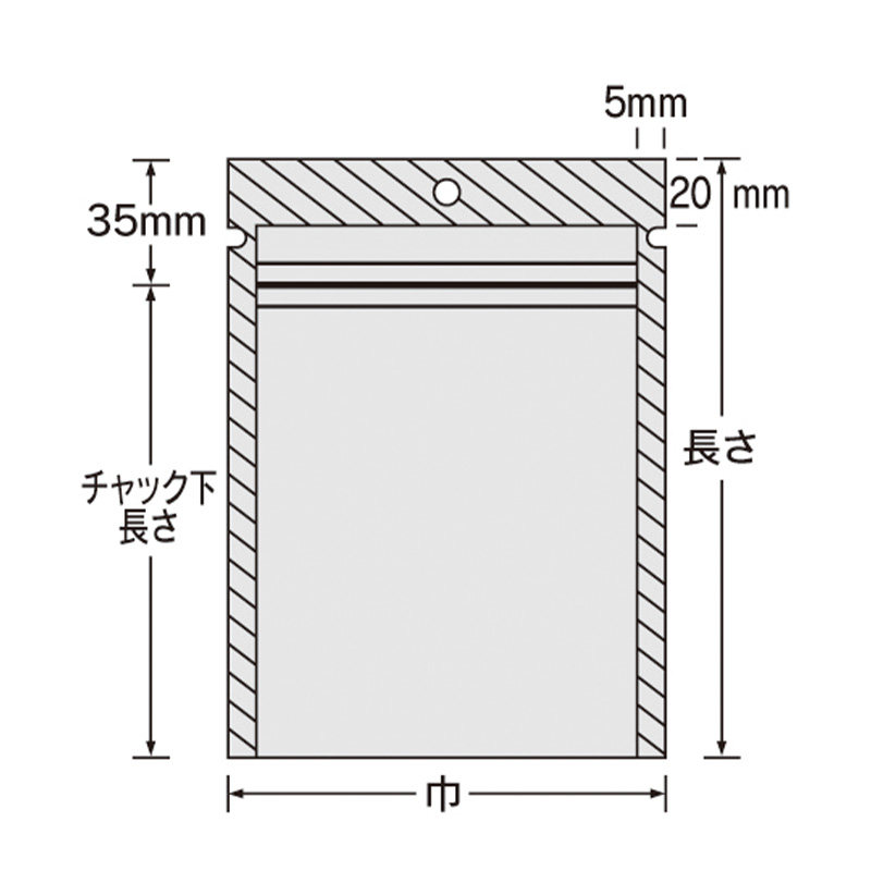 | 仕様 | 両サイド10mm・上部20mmシール、フック穴付、チャック付、ノッチ付 |