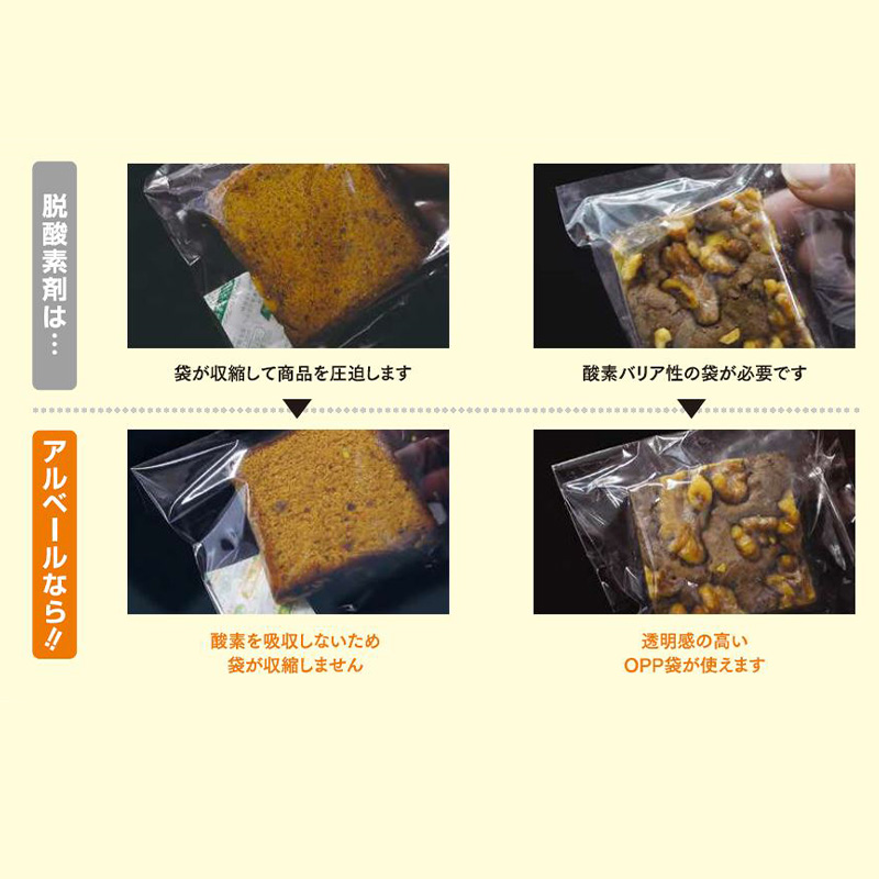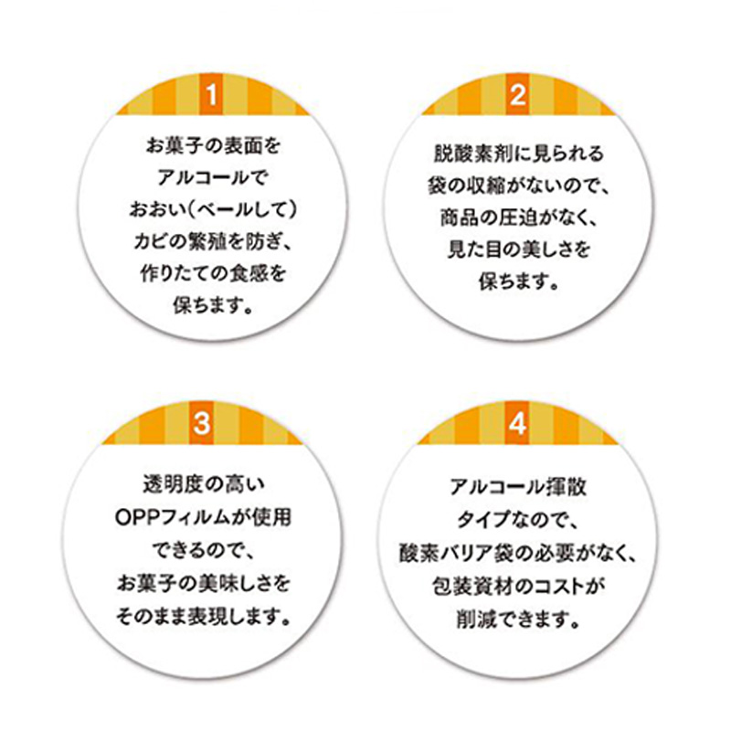 アルコール揮散剤アルベールは、包装容器内でエチルアルコールを揮散させて食品のカビを防ぎます。食品の柔らかさを守り作りたての食感を保ちます。アルコールで食品をベール(覆う)という意味をネーミングに込めました。特長:●カビの発生を抑えます。食品が硬くなりにくく、作りたてのしっとりした食感を保ちます。●脱酸素剤に見られる酸素の吸収がないので、商品の圧迫がなく、柔らかさを守り、見た目の美しさを保ちます。●透明度の高いOPPフィルムが使用できるので、お菓子のおいしさをそのまま表現します。●アルコール揮散タイプなので、酸素バリア袋の必要がなく、包装コストを抑えることができます。●原材料に鉄系のものを使用していないため、金属検知器が使用できます。●内容物はシリカ(二酸化ケイ素)にアルコールを吸着させたもので、安全性が高いものです。アルコール揮散タイプなので、脱酸素剤特有の反応熱は生じません。用途:パウンドケーキ、マドレーヌ、フィナンシェ、バウムクーヘン、マフィン、デニッシュパン、中華麺(半生)、珍味(さきいか)、黒糖などカビの生えやすい食品に適しています。中程度~高い食品に(Aw0.60~0.90)OPP/PE、OPP/CPP、OPP単体、KOP/PE その他※エチルアルコールガスを通しにくい包材をご利用ください。(原則、エチルアルコールガス透過10g/?・24hr・40℃ 以下のもの)※アルコールガスが通りやすい包装袋の使用、シール不良、ピンホールがありますと、外部にアルコールガスが揮散してしまい、品質保持期間が短くなったりカビが発生する場合がございますので、ご注意してください。